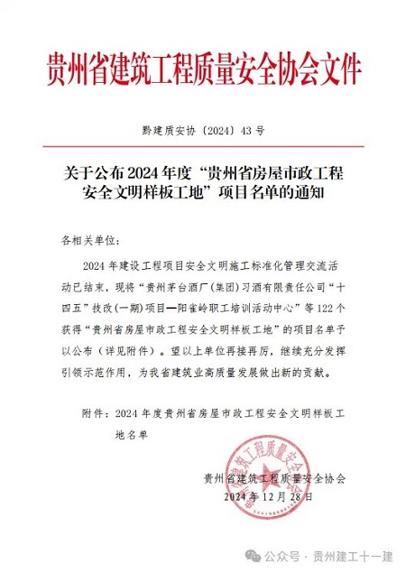 近日,贵州省建筑业协会、贵州省建筑工程质量安全协会分别公布2024年度贵州省优质工程、贵州省绿色施工 示范工程、贵州省房屋市政工程安全文明样板工地、贵州省建筑工程优质质量结构工程项目名单,公司3个项目荣 获奖项。
